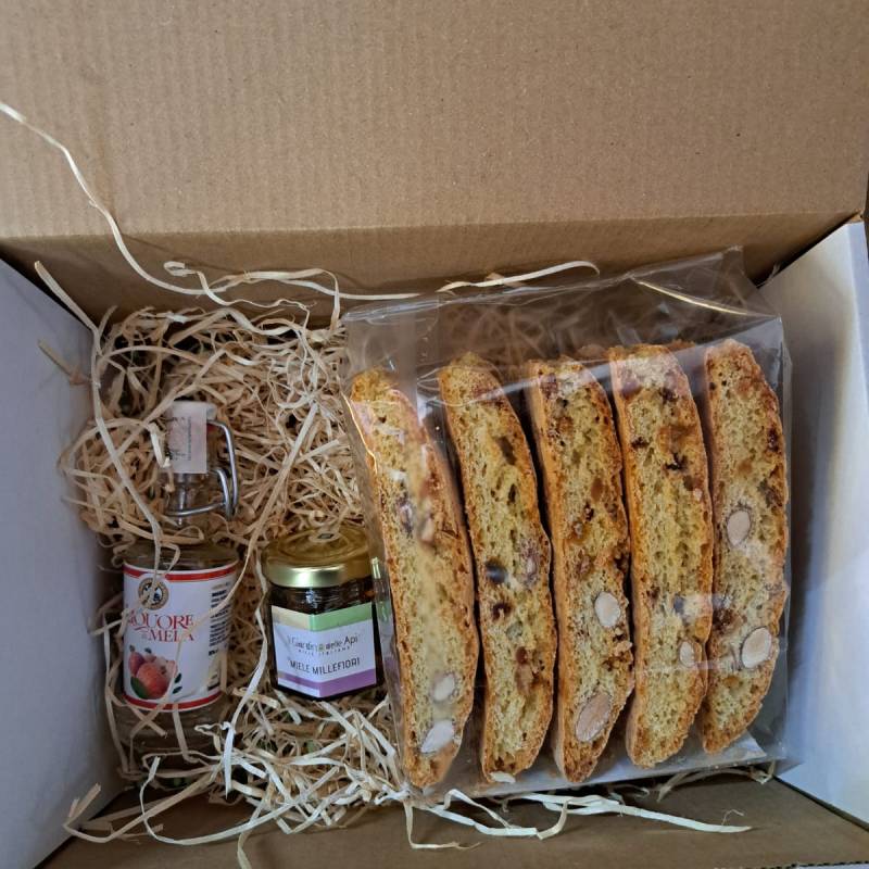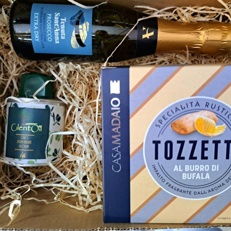 Questa box contiene: Tozzetti al burro di bufala, prosecco tenuta Sant'Anna e bottiglietta di olio extra vergine di oliva del Cilento