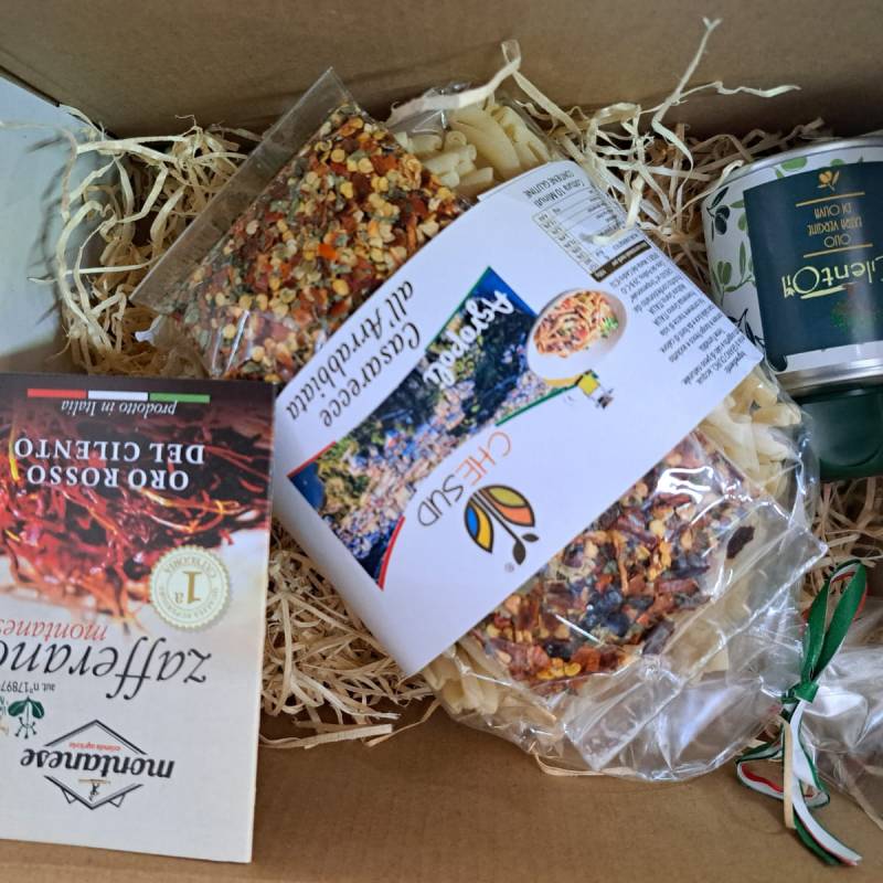 QUESTA BOX CONTIENE: caserecce all'arrabbiata, zafferano e olio del Cilento extra vergine