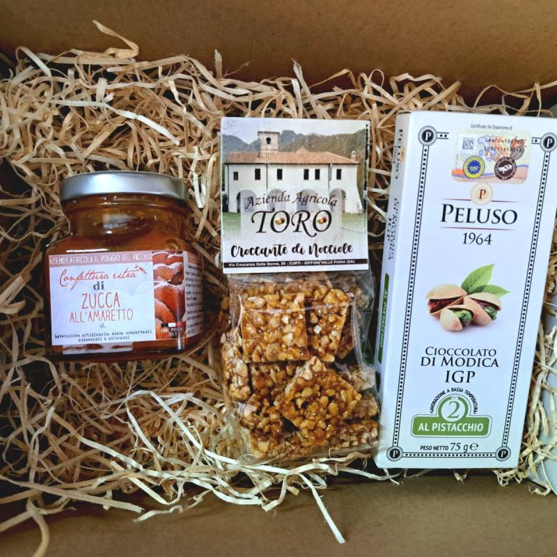 Questa Box contiene: Croccante di nocciole, zucca all'amaretto e cioccolata di modica IGP